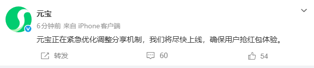 元宝官方账号回应表示:“正在紧急优化调整分享机制,将尽快上线,确保用户抢红包体验。”