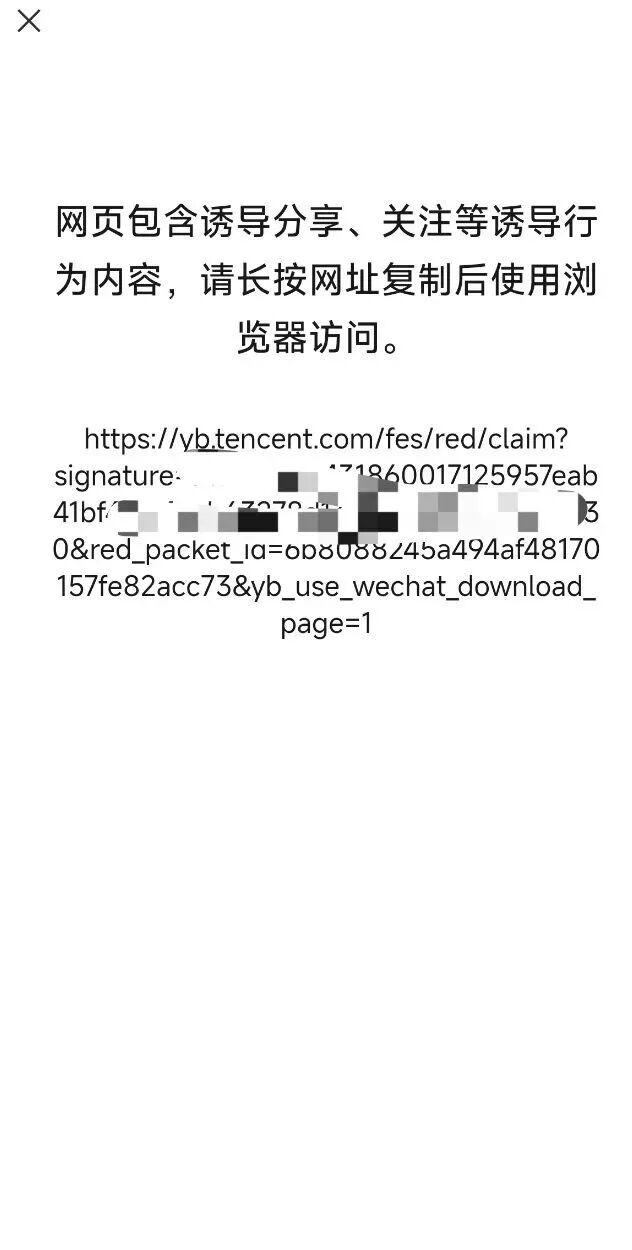 2月4日,记者发现,腾讯元宝红包被微信屏蔽,红包链接已无法正常打开。页面显示,网页包含诱导分享、关注等诱导行为内容,请长按网址复制后使用浏览器访问。