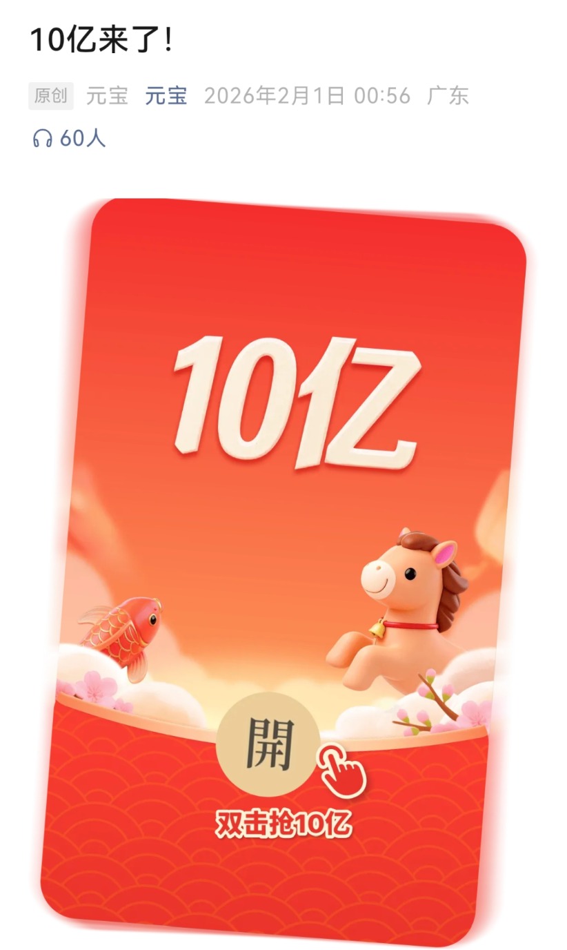 2月1日凌晨,元宝微信公众号发文称:10亿现金红包开抢!不少网友称:“一早起来就被腾讯元宝红包刷屏了”“元宝的红包裂变已经在微信里轮番炸群”。