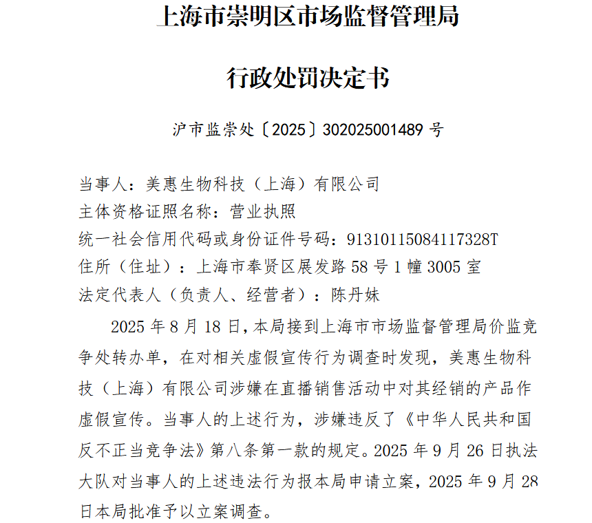 上海市市场监管局公布的行政处罚决定书显示,美惠生物科技(上海)有限公司为上海菌小宝健康科技有限公司的“菌小宝系列”产品在电商渠道的经销商。