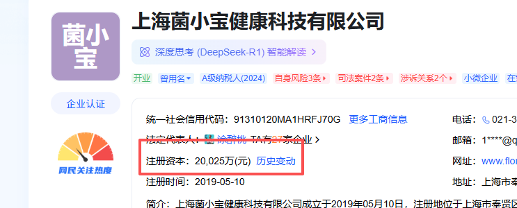 企查查显示,上海菌小宝健康科技有限公司成立于2019年,注册资本20025万元,法定代表人为涂醉桃。