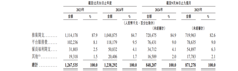 数据显示,2023年、2024年和2025年前三季度,该公司的销售及分销开支分别为12.68亿元、12.38亿元和8.71亿元,收入占比分别为65.1%、59.4%和57.6%。如果将这笔费用进一步拆分,推广开支占同期销售及分销开支的比例达87.9%、84.7%和82.6%。