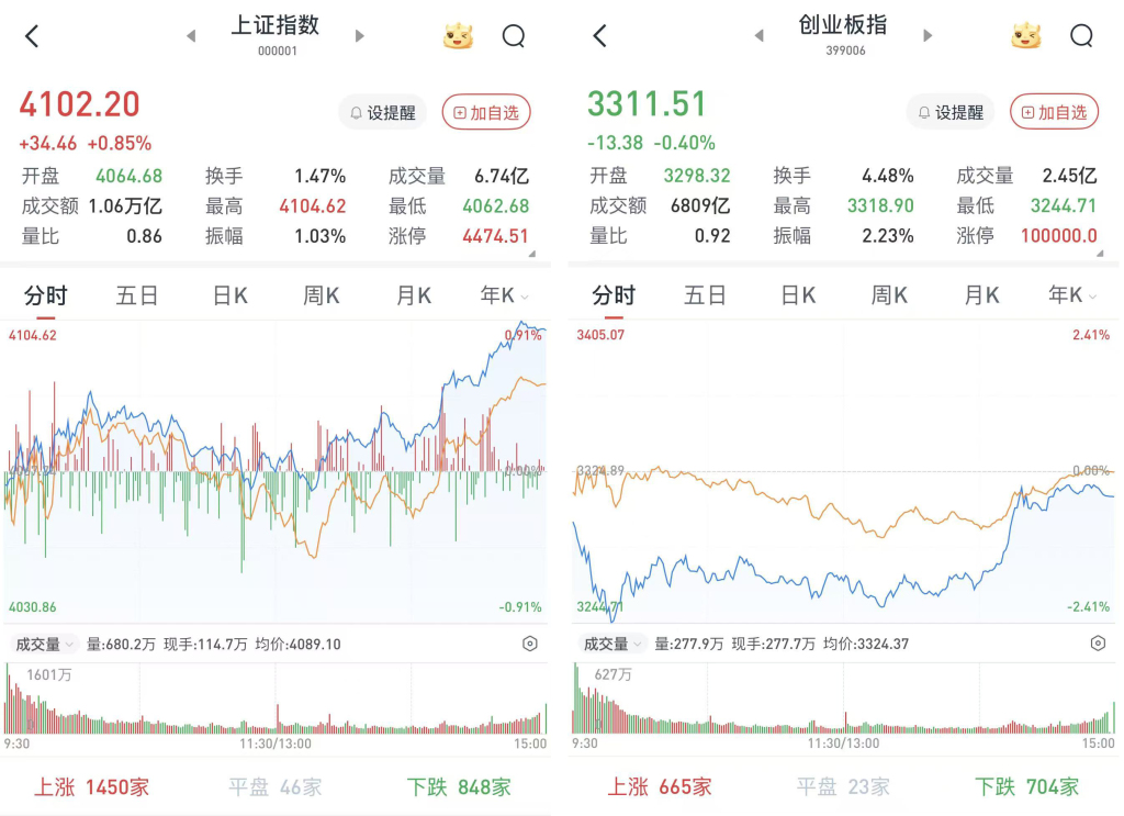 至收盘,上证综指涨0.85%,报4102.2点;科创50指数跌1.2%,报1453.48点;深证成指涨0.21%,报14156.27点;创业板指跌0.4%,报3311.51点。