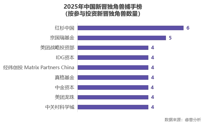 而在2025年中国新晋独角兽的独角兽轮次融资事件中,共146家机构参与,京国瑞基金参投了3家独角兽,建信投资、君联资本等7家机构各参投2家独角兽。