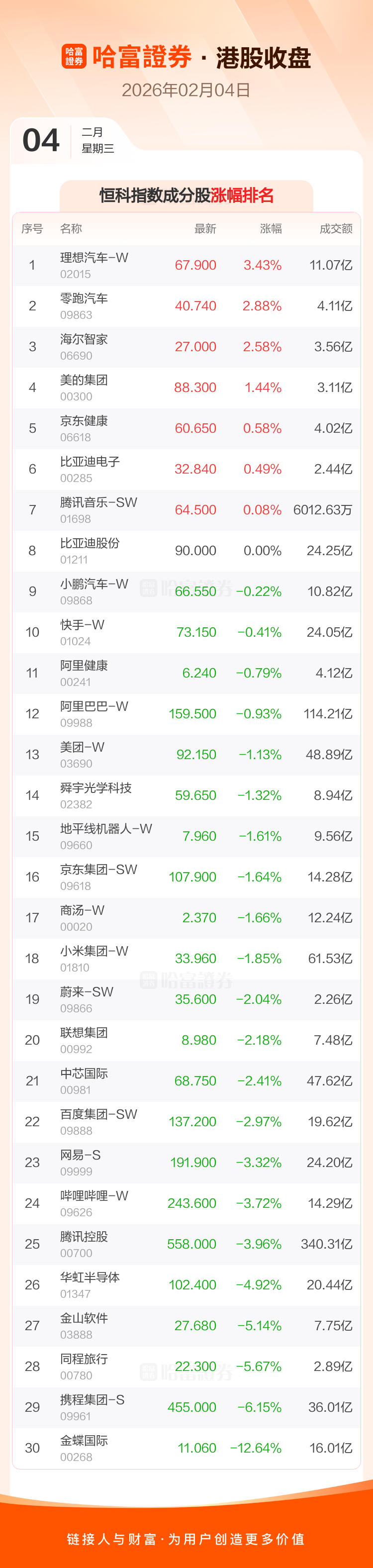 港股2月4日收盘走高,恒生指数收报26847.32点,涨12.55点,涨幅0.05%;恒生科技指数收报5366.44点,跌100.82点,跌幅1.84%。恒生指数成分股中信义玻璃、中国神华、华润置地涨幅居前,携程集团-S、腾讯控股、网易-S跌幅靠前。恒生科技指数成分股中理想汽车-W、零跑汽车、海尔智家涨幅居前,金蝶国际、携程集团-S、同程旅行跌幅靠前。