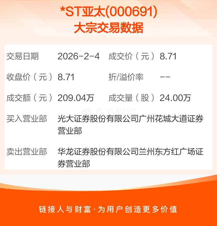 2026年2月4日,*ST亚太发生1笔大宗交易,共成交24.00万股,成交金额209.04万元,占其流通市值比例为0.07%。