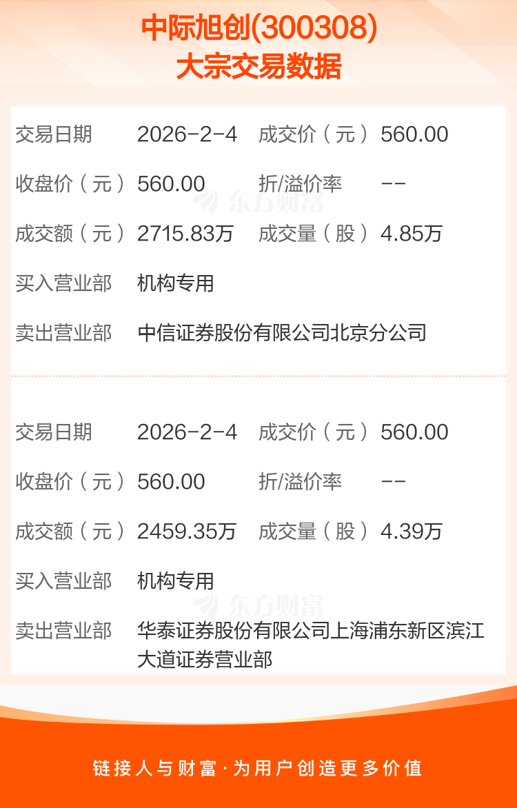 2026年2月4日,中际旭创发生2笔大宗交易,共成交9.24万股,成交金额5175.18万元。