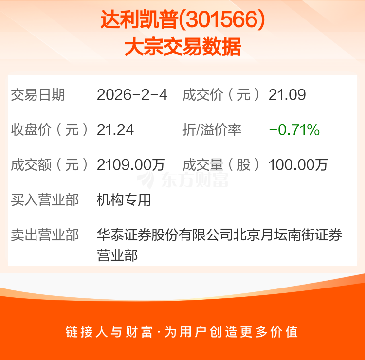 2026年2月4日,达利凯普发生1笔大宗交易,共成交100.00万股,成交金额2109.00万元,占其流通市值比例为0.48%。