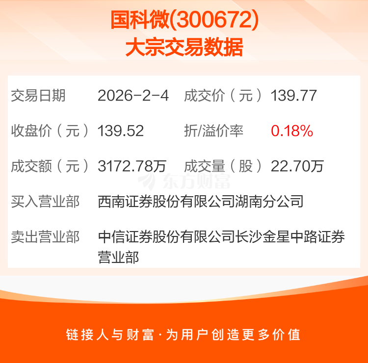 2026年2月4日,国科微发生1笔大宗交易,共成交22.70万股,成交金额3172.78万元,占其流通市值比例为0.11%。