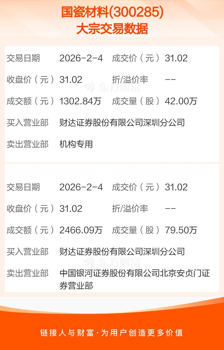 2026年2月4日,国瓷材料发生2笔大宗交易,共成交121.50万股,成交金额3768.93万元,占其流通市值比例为0.14%。