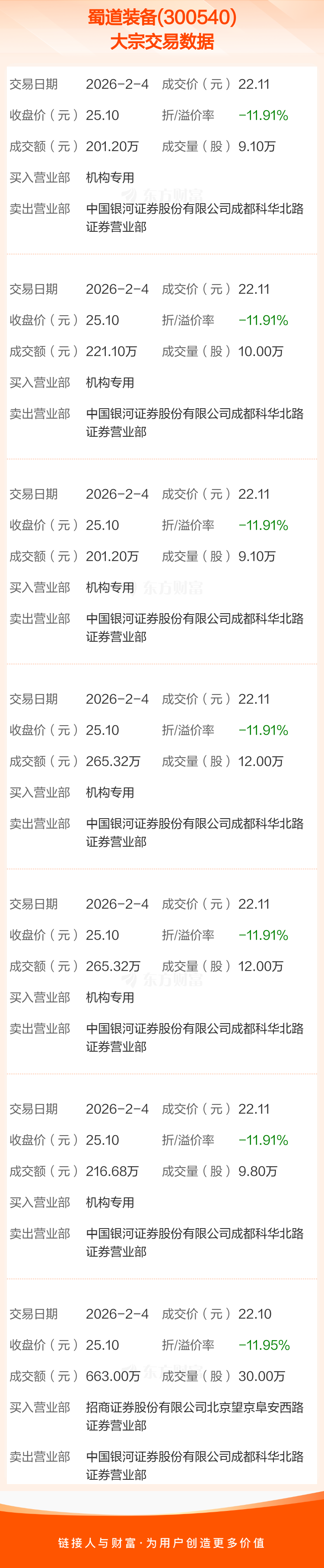 2026年2月4日,蜀道装备发生7笔大宗交易,共成交92.00万股,成交金额2033.82万元,占其流通市值比例为0.39%。