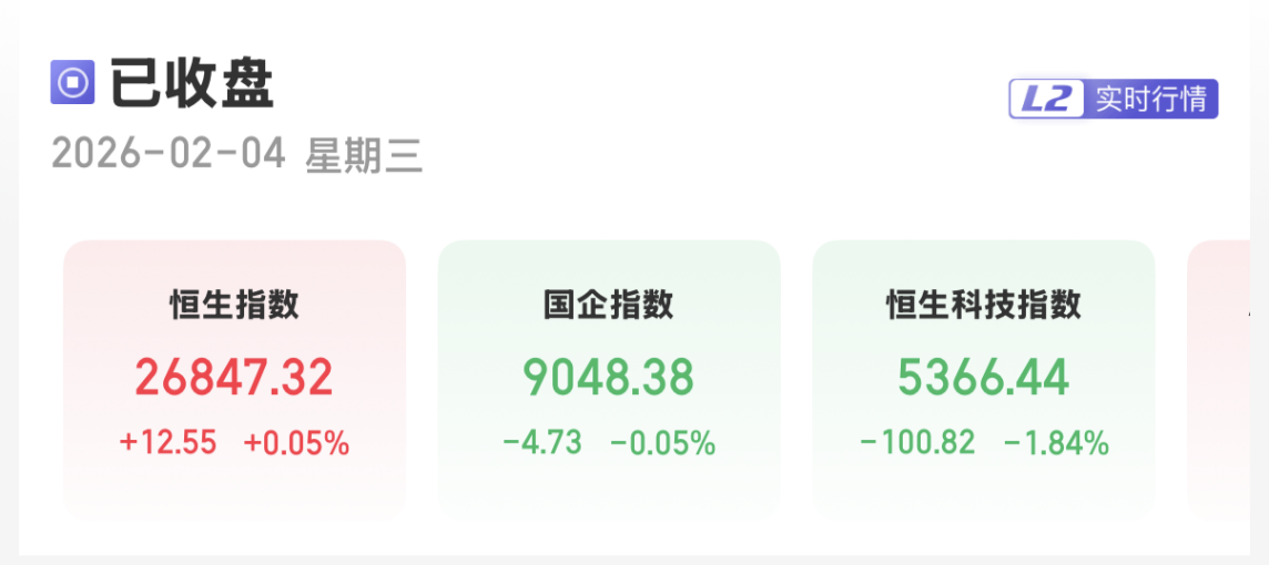 上证报中国证券网讯2月4日,港股三大指数涨跌互现。截至收盘,恒生指数涨0.05%,报26847.32点;恒生国企指数跌0.05%,报9048.38点;恒生科技指数跌1.84%,报5366.44点。