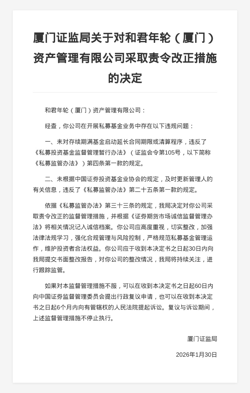 和君年轮(厦门)资管被责令改正,涉基金业务违规
