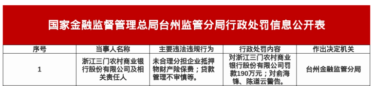 浙江三门农商行被罚190万,涉贷款管理不审慎等