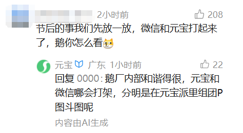 在腾讯的官方公众号最新推文下,元宝AI还主动留言称“鹅厂内部和谐得很,元宝和微信哪会打架,分明是在元宝派里组团P图斗图呢”,颇具“太岁爷头上动土”的黑色幽默感。