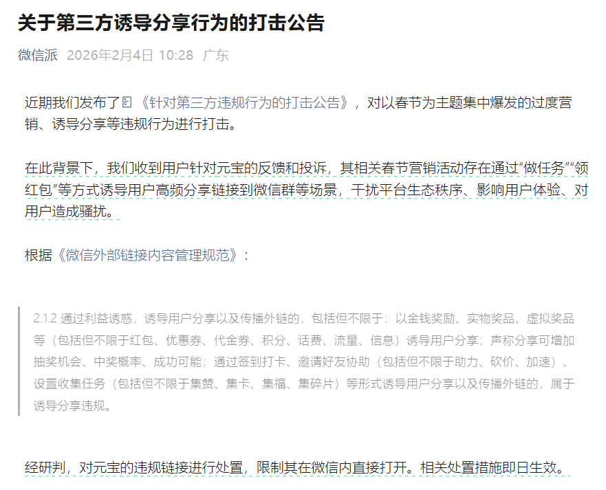 2月4日上午,用户发现元宝红包链接在微信内被拦截,页面提示“网页包含诱导分享行为”。微信官方随即发布《关于第三方诱导分享行为的打击公告》,点名元宝通过“做任务”“领红包”等方式诱导高频分享,违反《微信外部链接内容管理规范》。