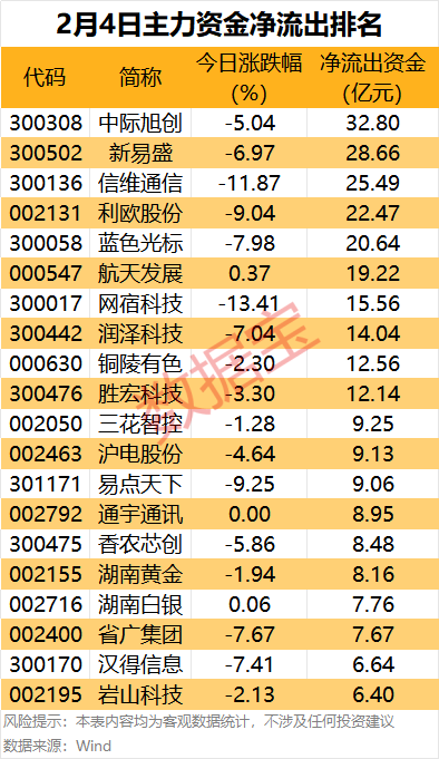 据数据宝统计,84股遭主力资金净流出超2亿元,其中中际旭创、新易盛、信维通信、利欧股份、蓝色光标、航天发展等净流出金额均超10亿元。