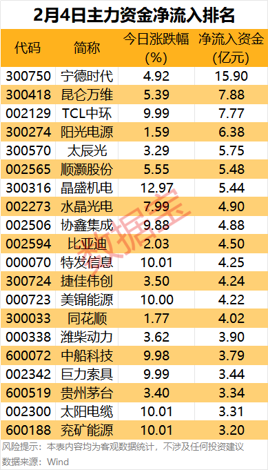 从个股来看,39股获主力资金净流入超2亿元,其中7股净流入超5亿元。