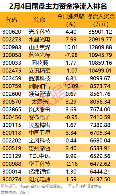 从个股来看,光库科技、水晶光电尾盘获主力资金净流入均超2亿元。山西焦煤、蓝色光标、同花顺、立讯精密等净流入金额均超1亿元。