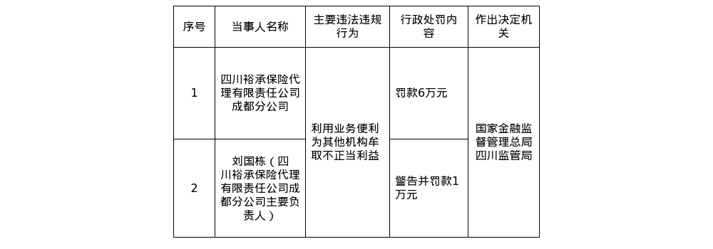 四川裕承保险成都分公司被罚6万,涉利用业务便利为其他机构牟利