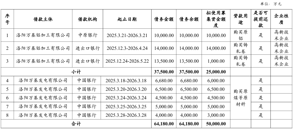 本期债券发行金额上限5亿元,期限3+2年,募集资金中2.5亿元用于偿还科技型子公司洛阳万基铝加工有限公司银行借款,2.5亿元用于偿还发行人其他子公司银行借款。