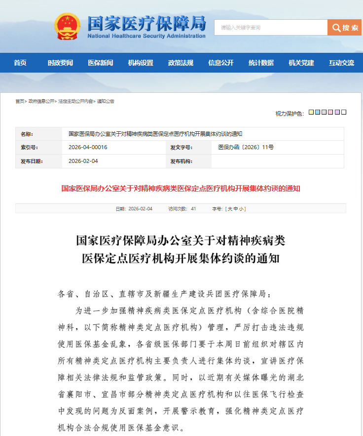 据央视新闻消息,2月4日,国家医保局发出通知,为进一步加强精神疾病类医保定点医疗机构(含综合医院精神科,以下简称精神类定点医疗机构)管理,严厉打击违法违规使用医保基金乱象,各省级医保部门要于本周日前组织对辖区内所有精神类定点医疗机构主要负责人进行集体约谈,宣讲医疗保障相关法律法规和监管政策。