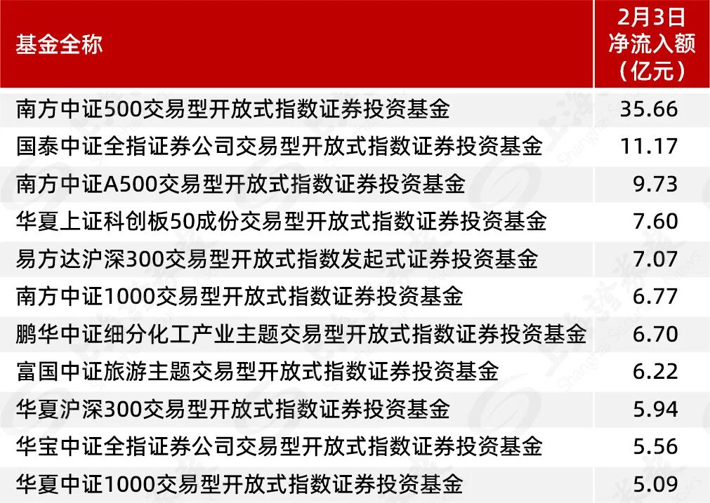 据Choice测算,2月3日,股票型ETF(剔除跨境ETF)净流入69.65亿元,其中多只宽基ETF吸引资金涌入。具体来看,南方中证500ETF净流入35.66亿元,南方中证A500ETF、华夏科创50ETF、易方达沪深300ETF、南方中证1000ETF、华夏沪深300ETF等净流入均超5亿元。