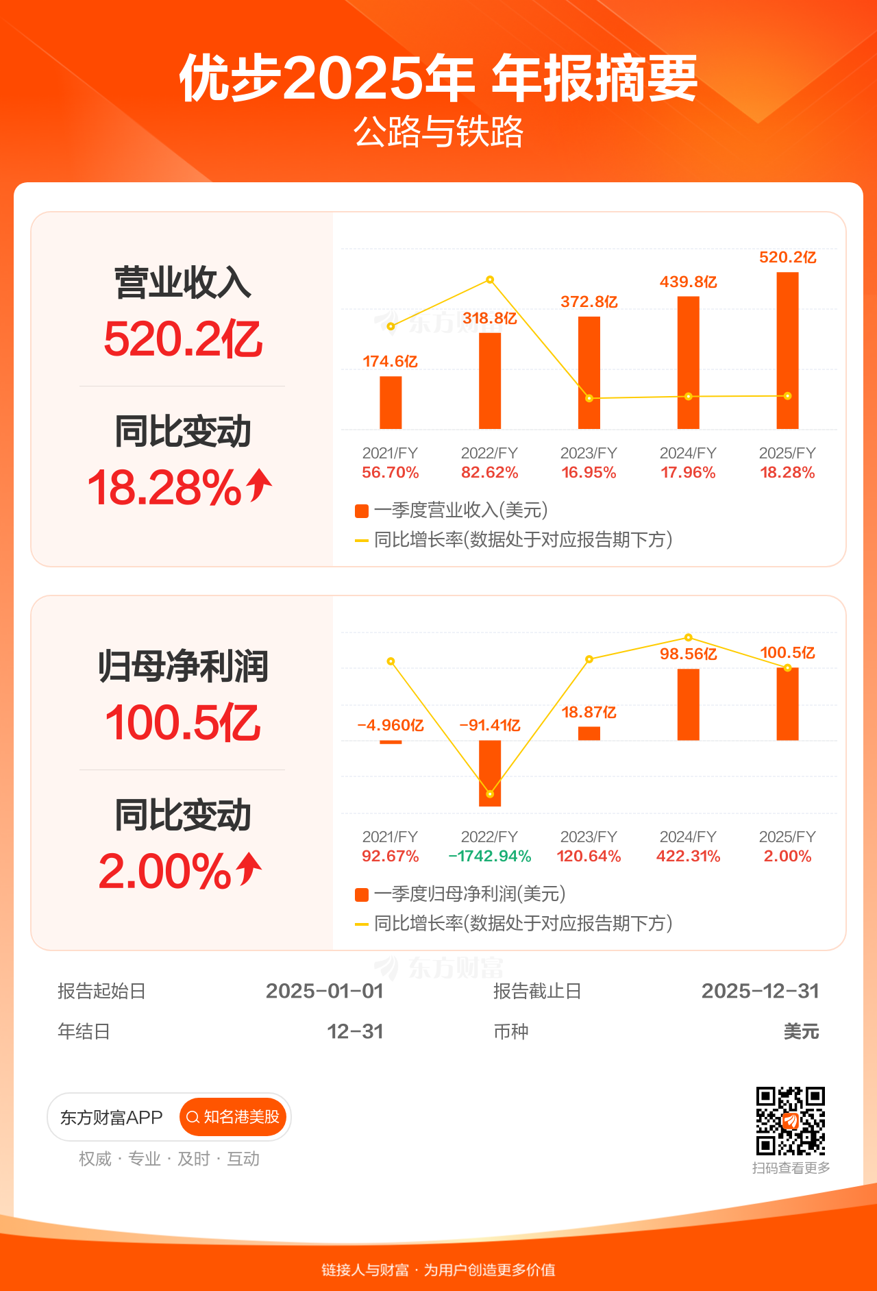 优步2月4日发布年报业绩,截至2025年12月31日的12个月内,该公司营业收入520.17亿美元,同比增长18.28%;公司权益持有人应占溢利(归母净利润)100.53亿美元,同比增长2.00%,高于机构一致预测的78.35亿美元。