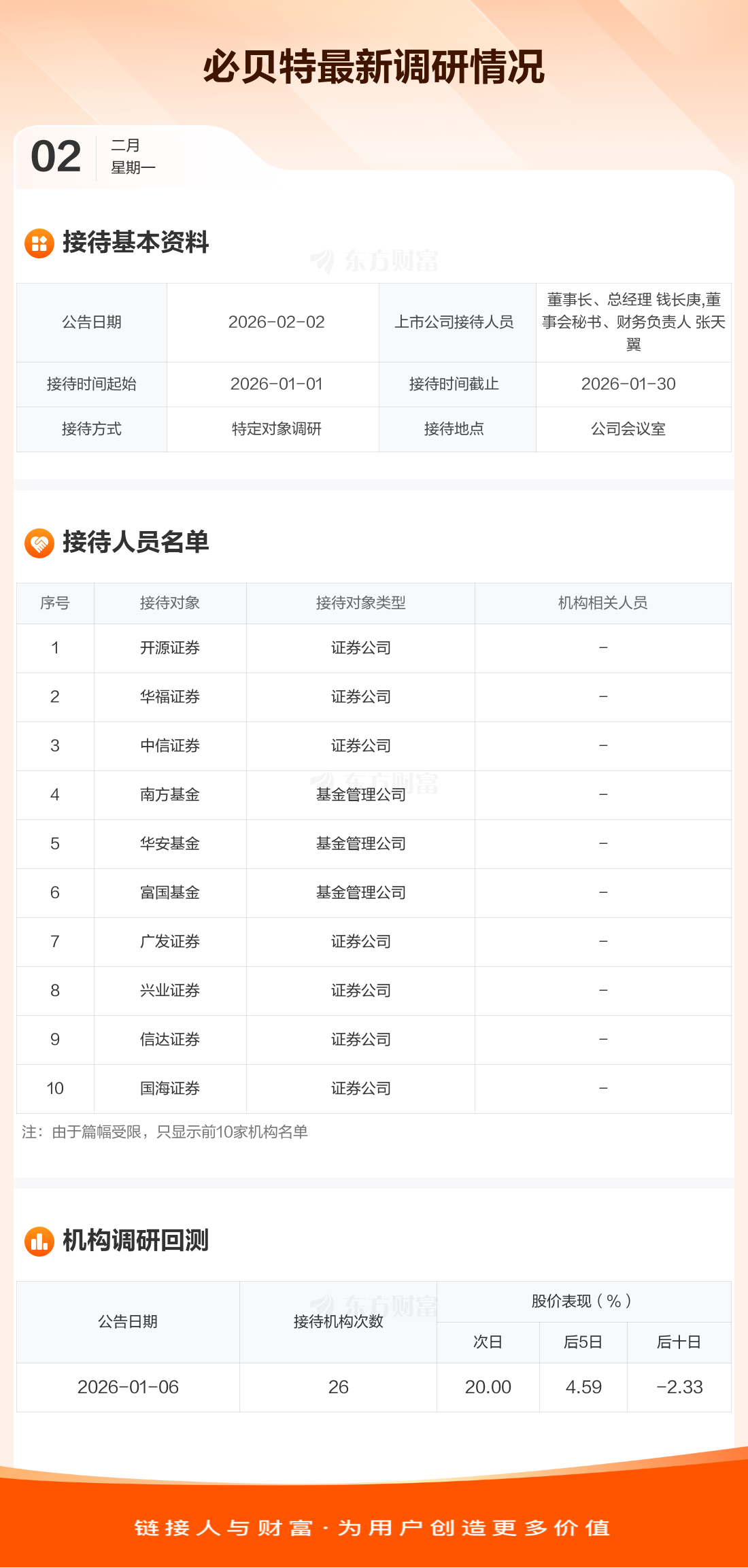 必贝特2月2日公告称,1月1日至1月30日接待开源证券等21家机构调研。接待人员包括董事长、总经理 钱长庚,董事会秘书、财务负责人 张天翼。