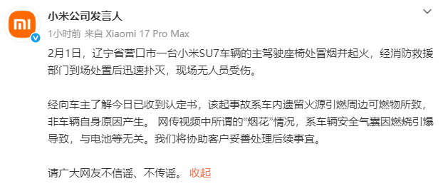 2月4日,小米公司发言人账号发文,回应近期辽宁一辆小米SU7起火事故。