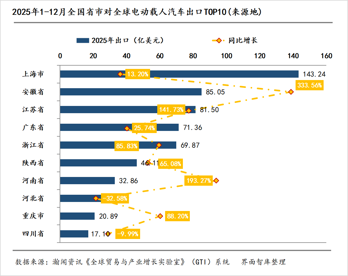 二、头部集聚效应持续凸显,区域出口增速两极分化1–12月,中国电动载人汽车出口的来源地格局保持稳定,头部来源地引领增长。上海市以143.24亿美元的出口额位居全国首位,同比增长13.20%,保持稳健增长态势;安徽省位列第二,出口额达85.05亿美元,同比激增333.56%;江苏省紧随其后,出口额为81.50亿美元,同比增幅达141.73%,增长动力强劲。1-12月TOP10来源地出口金额合计达596.96亿美元,占全国电动载人汽车总额的85.08%,凸显头部省市对出口增长的核心支撑作用。