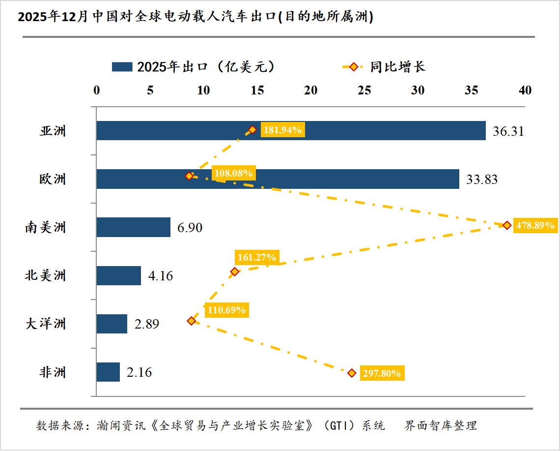 从出口目的地的大洲维度来看,中国电动载人汽车出口正持续夯实 “核心市场稳根基、潜力市场提增量” 的双轮驱动发展格局。核心市场层面,亚洲与欧洲依旧是出口增长的中坚力量,筑牢出口基本盘。亚洲作为中国电动载人汽车出口的战略核心区域,12 月对 49 个合作国家实现出口额 36.31 亿美元,较 2024 年同期的 12.88 亿美元实现大幅攀升,市场根基持续筑牢;欧洲市场则延续强势表现,对 39 个国家的出口额达 33.83 亿美元,较去年同期的 16.26 亿美元实现翻倍增长,印证了中国电动载人汽车在全球高端市场的竞争力与认可度不断提升。