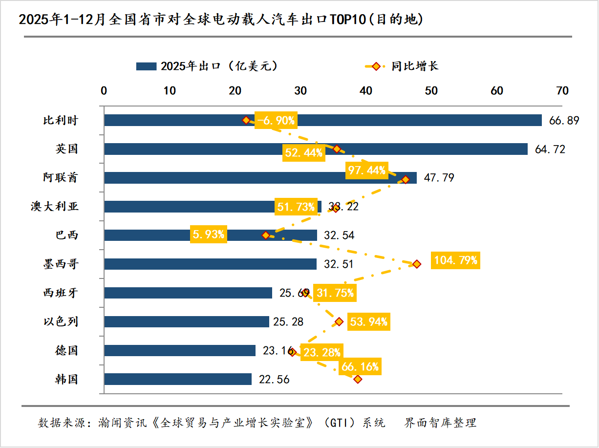 1-12月,中国对全球电动载人汽车出口贸易额最高的目的地是比利时,为66.89亿美元,同比下降6.90%;其次是英国,为64.72亿美元,同比增长52.44%;第三是阿联酋,为47.79亿美元,同比增长97.44%。TOP10目的地合计为374.35亿美元,占总出口额的53.36%。与1-11月相比,TOP10格局未发生变化,整体保持稳定态势。
