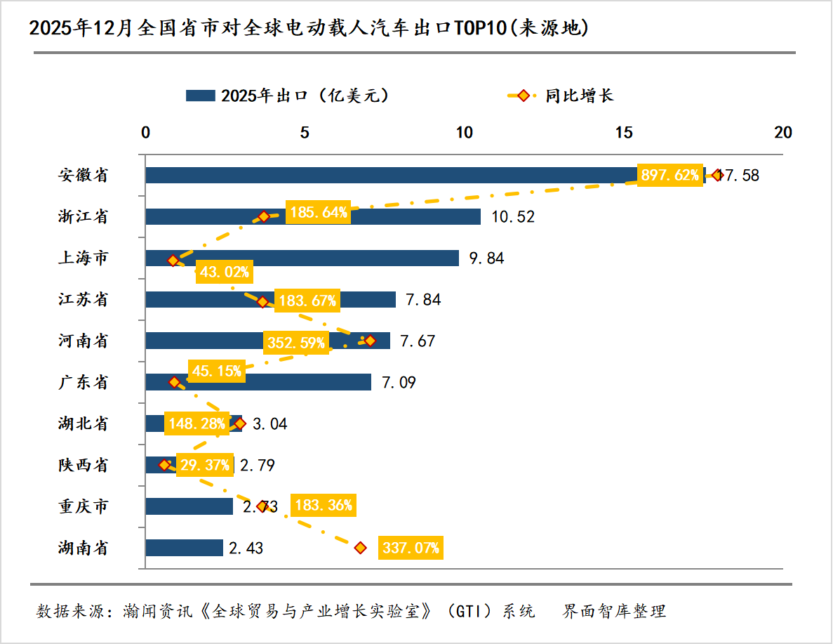 与11月相比,12月电动载人汽车出口前十大来源地格局总体稳定,位次略有微调。安徽以7.58亿美元的出口额占据榜首,与浙江、上海共同构成第一梯队。区域格局出现局部变动,湖北、湖南为本期新晋入围省份,而河北、四川则跌出前十行列。