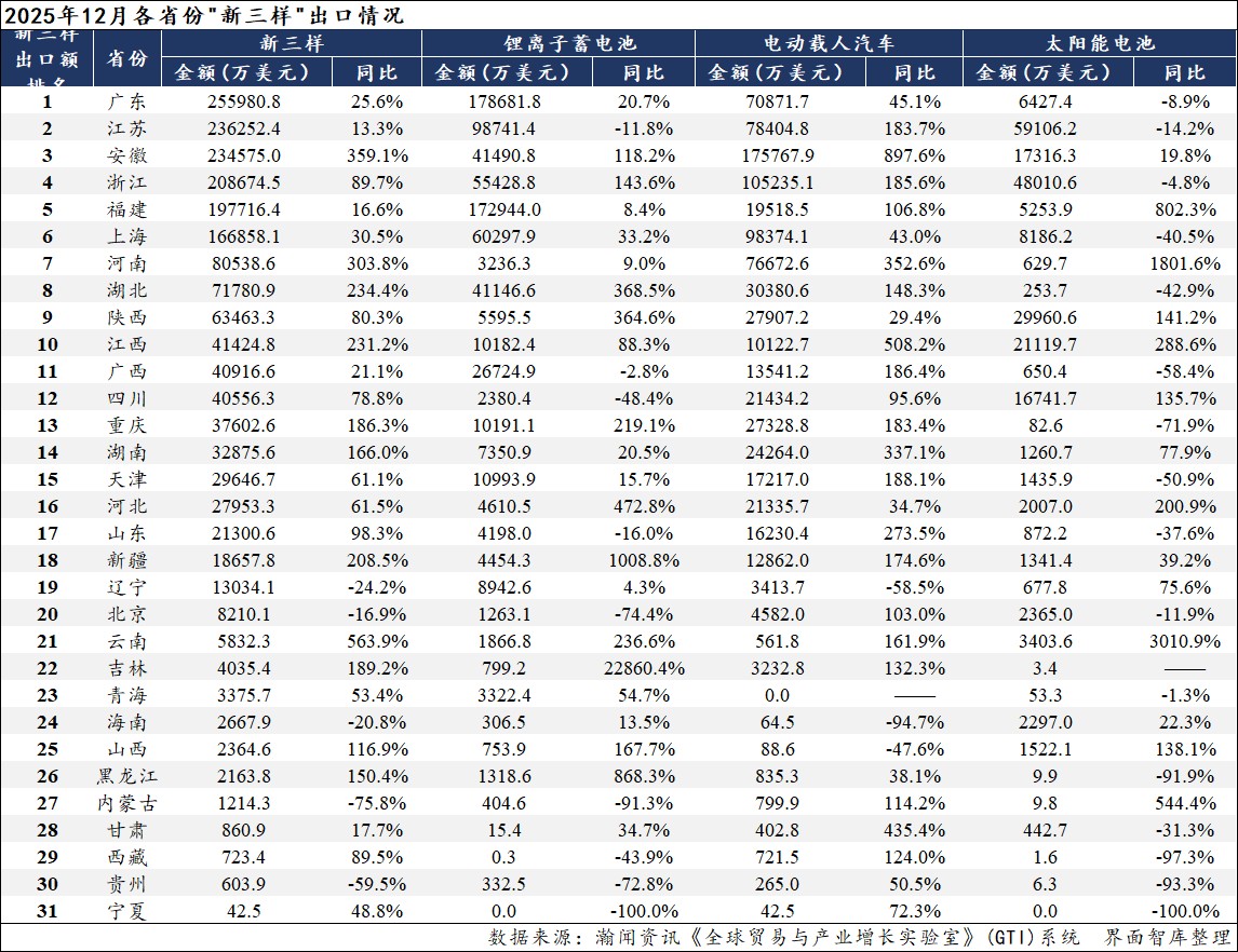 1-12月,全国“新三样”出口规模前十大省份依然是广东、江苏、上海、福建、浙江、安徽、陕西、四川、广西、湖北,与1-11月相同。