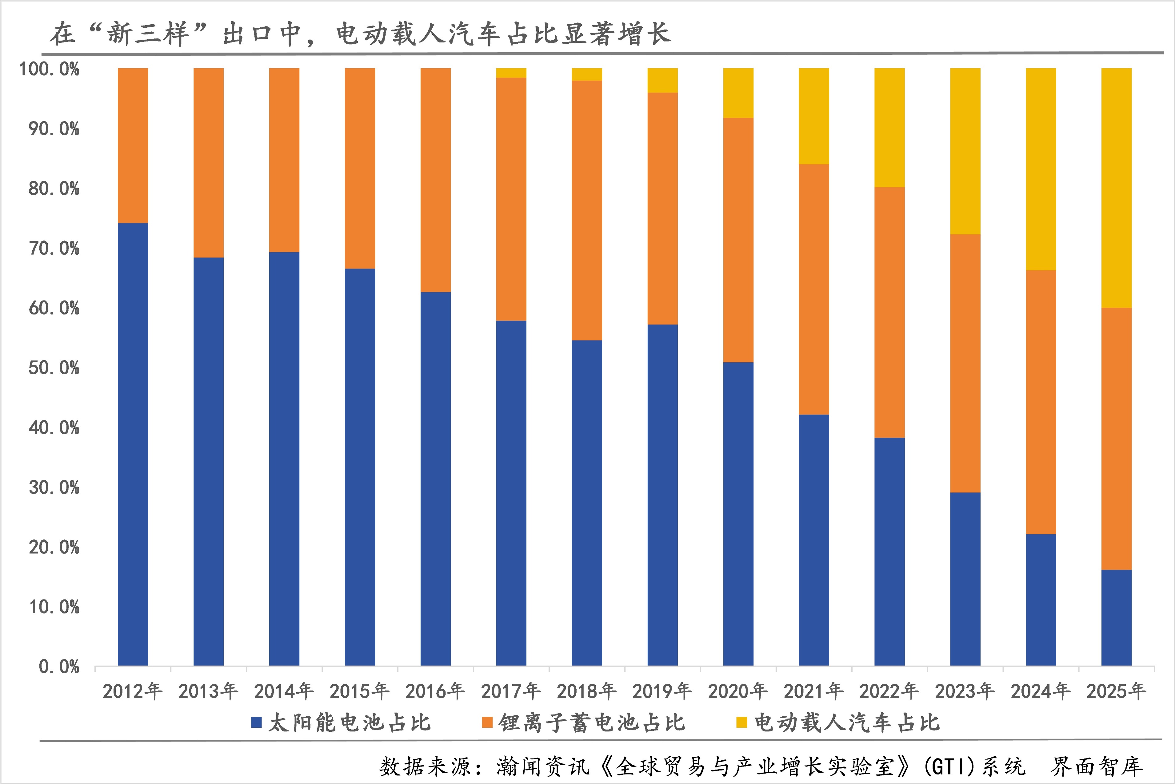 2025年1-12月,锂离子蓄电池、电动载人汽车、太阳能电池在“新三样”出口中的占比分别为43.8%、40.1%和16.1%,与上年相比,电动载人汽车占比上升了6.3个百分点,锂离子蓄电池、太阳能电池占比则分别下降了0.3、6.0个百分点。
