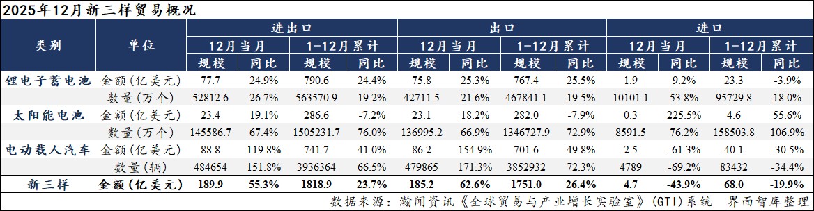 据界面智库和瀚闻资讯统计,2025年1-12月,我国“新三样”进出口总额1818.9亿美元,同比增长23.7%。其中,出口1751.0亿美元,同比增长26.4%;进口68.0亿美元,同比下降19.9%。12月当月,我国“新三样”进出口总额189.9亿美元,环比增长11.5%,同比增长55.3%、较上月加快4.0个百分点。其中,出口185.2亿美元,环比增长13.6%,同比增长62.6%、较上月加快8.0个百分点;进口4.7亿美元,环比下降36.1%,同比下降43.9%、较上月放缓46.7个百分点。