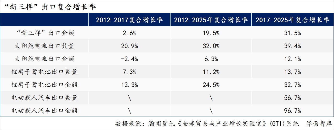 电动载人汽车在2017-2025年间呈“爆炸式”增长,年均增速高达96.7%,与此同时,出口的金额增速远超出口的数量增速。同期,锂离子蓄电池出口金额年均增速为32.7%,也高于出口数量年均增速13.7%;太阳能电池则相反,出口数量年均增速达39.4%、出口金额年均增速仅为12.1%。