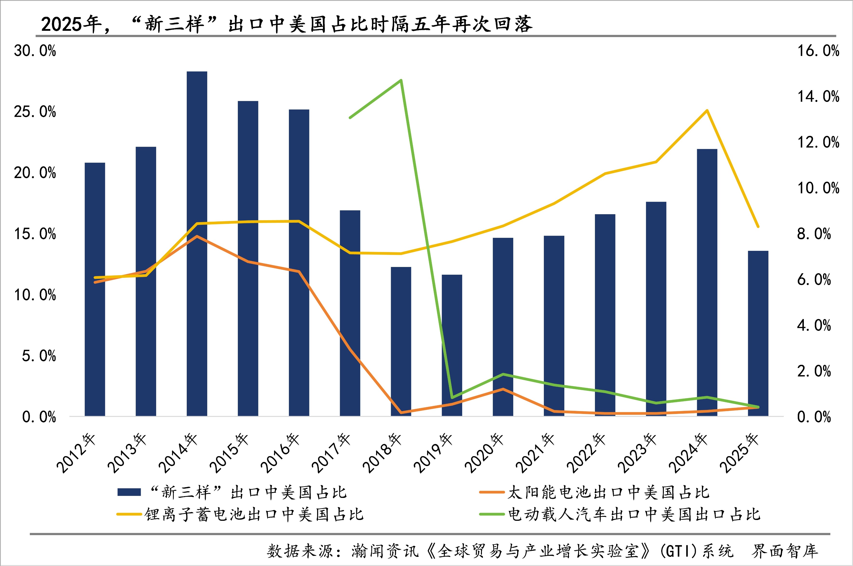 2025年,“新三样”出口中的美国占比为7.2%,结束了连续5年的上升,较2024年下降4.4个百分点,低于历史最高值7.8个百分点。分产品来看,美国对“新三样”的影响主要集中在锂离子蓄电池,在其出口中,美国占比虽较2024年的历史最高值下降了9.5个百分点,在2025年仍占15.5%;太阳能电池出口中,美国占比已连续五年不足1%,2025年占比为0.7%,较2014年的历史最高值下降14.0个百分点;电动载人汽车出口中,美国占比早在2019年即已降至2%附近,2025年则首次降至1%以下。