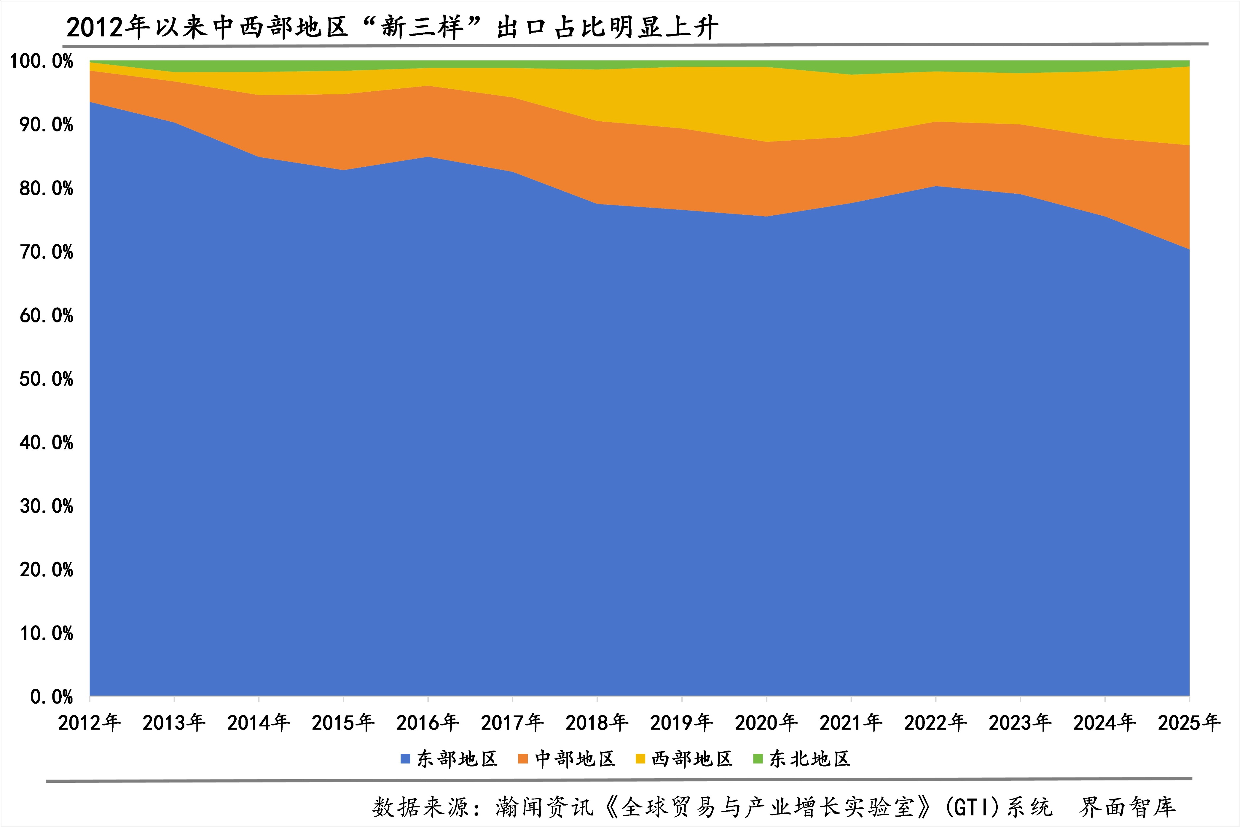 “新三样”出口发货人地区分布更加均衡。2025年,东部地区在“新三样”出口中的占比降至历史新低70.3%,较2024年下降5.2个百分点、较2012年下降23.2个百分点;与之相对的是,中部地区、西部地区在“新三样”出口中的占比再创历史新高,二者较2024年分别上升4.0、1.9个百分点至16.4%、12.4%,较2012年分别上升11.5、11.1个百分点。东北地区变化不大,2025年占比为1.0%,较2024年下降0.7个百分点、较2012年上升0.6个百分点。