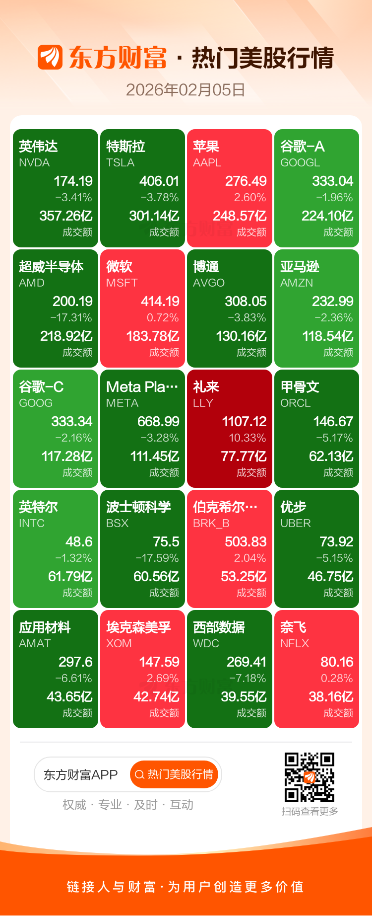英伟达跌3.41%,特斯拉跌3.78%,苹果涨2.60%,谷歌-A跌1.96%,超威半导体跌17.31%,微软涨0.72%,博通跌3.83%,亚马逊跌2.36%,谷歌-C跌2.16%,Meta Platforms Inc-A跌3.28%。