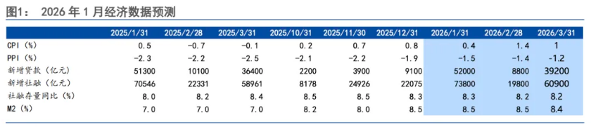 物价方面,1月猪肉价格小幅上行,鲜菜价格回落,鲜果价格上行,金价大幅上升,但高基数下,预计1月CPI同比小幅下行;1月出厂价格指数上升1.7个百分点至50.6%,主要原材料购进价格指数上升3个百分点至56.1%,预计1月PPI同比降幅继续收敛。信贷开门红或略低于预期,“化债”对企业中长贷的影响继续加强,同时,政策性金融工具可能对企业中长期贷款的支撑或进入尾声。总体来看,我们预计1月CPI同比0.4%,PPI同比-1.5%;我们预计1月新增信贷52000亿元,新增社融73800亿元,M2同比8.5%。