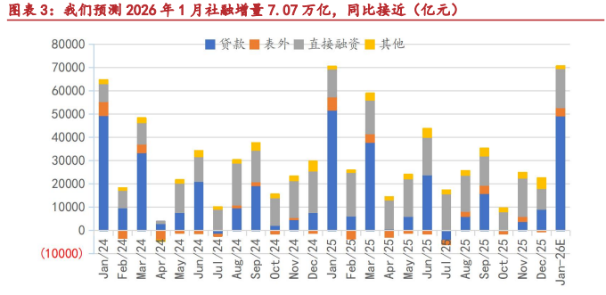 社融增量或同比接近,增速小幅回落。我们预测1 月份社融增量7.07万亿(2025年 1 月社融增量 7.05 万亿),同比接近。我们预计1 月对实体经济人民币贷款增量4.95 万亿,未贴现银行承兑汇票+3000 亿,企业债券净融资5000亿,政府债券净融资 1.1 万亿。我们预计 1 月社融增量同比接近,1 月末社融增速降至8.1%。社融增速于 2025 年 7 月阶段性见顶,未来几个月社融增速或继续回落,2026年末社融增速或降至 7.5%左右。我们预测 2026 年社融增量35 万亿左右。