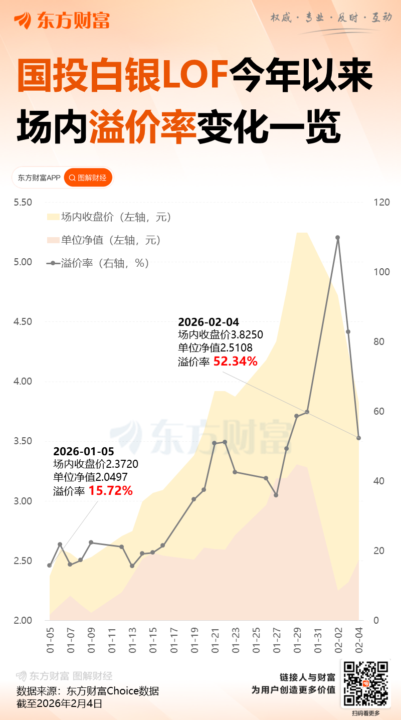 截至2月4日收盘,国投白银LOF被牢牢封于跌停板,最新价格报3.825元/份,连续三个交易日走出“一字跌停”。当日成交额攀升至2.39亿元。