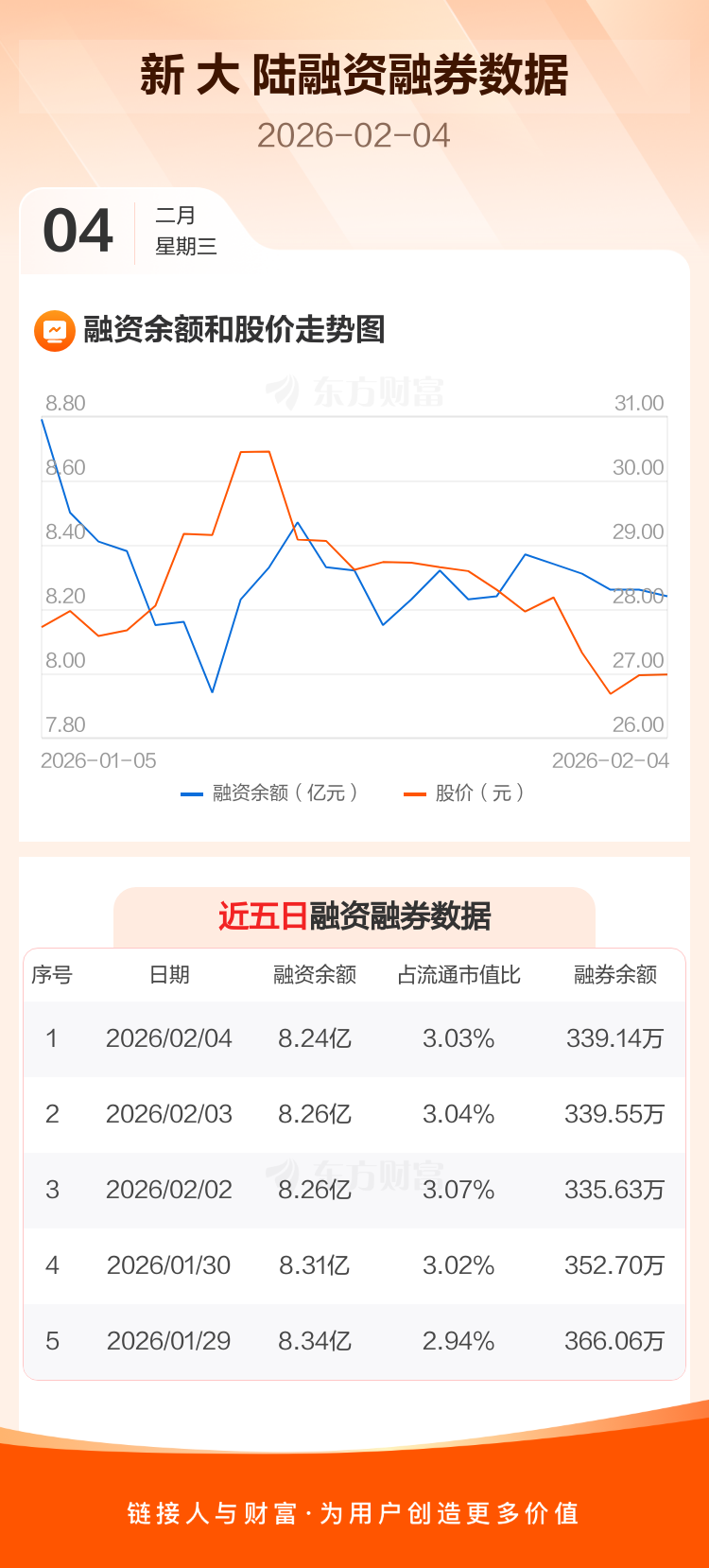 交易所最新数据显示,新 大 陆于2026年2月4日获融资买入3344.81万元,融资偿还3487.51万元,当日融资净偿还142.7万元。目前,该股融资余额8.24亿,占流通市值比例为3.03%。