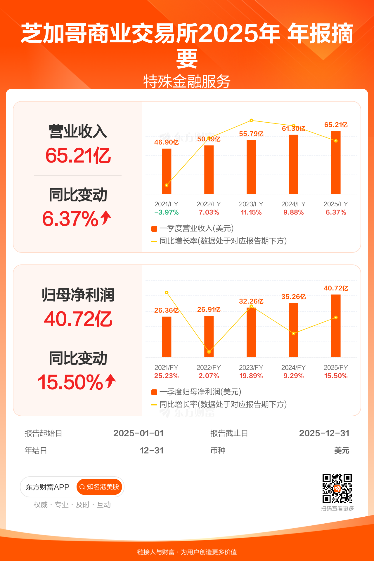 芝加哥商业交易所2月4日发布年报业绩,截至2025年12月31日的12个月内,该公司营业收入65.21亿美元,同比增长6.37%;公司权益持有人应占溢利(归母净利润)40.72亿美元,同比增长15.50%。