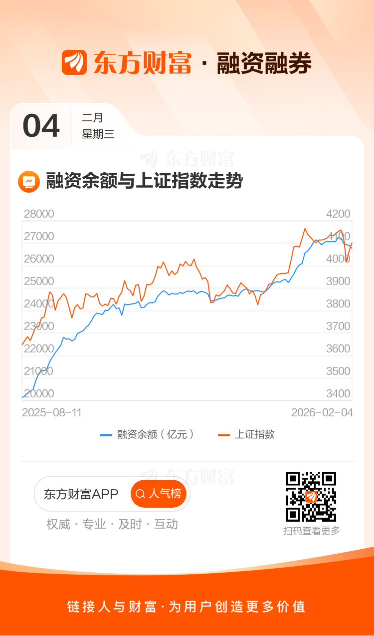 02月04日A股三大指数涨跌不一,杠杆资金呈净卖出之势,当天融资余额2.68万亿,较上一交易日减少139.42亿。