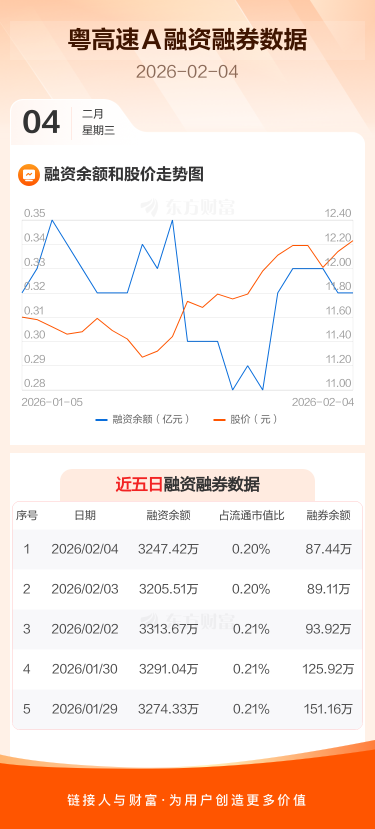 交易所最新数据显示,粤高速A于2026年2月4日获融资买入364.31万元,融资偿还322.41万元,当日融资净买入41.9万元。目前,该股融资余额3247.42万,占流通市值比例为0.20%。