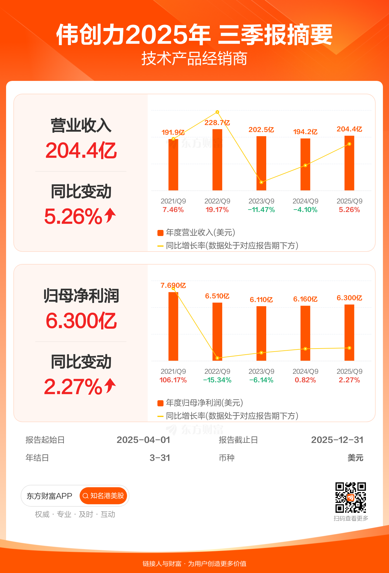伟创力2月4日发布三季报业绩,截至2025年12月31日的9个月内,该公司营业收入204.37亿美元,同比增长5.26%;公司权益持有人应占溢利(归母净利润)6.30亿美元,同比增长2.27%。