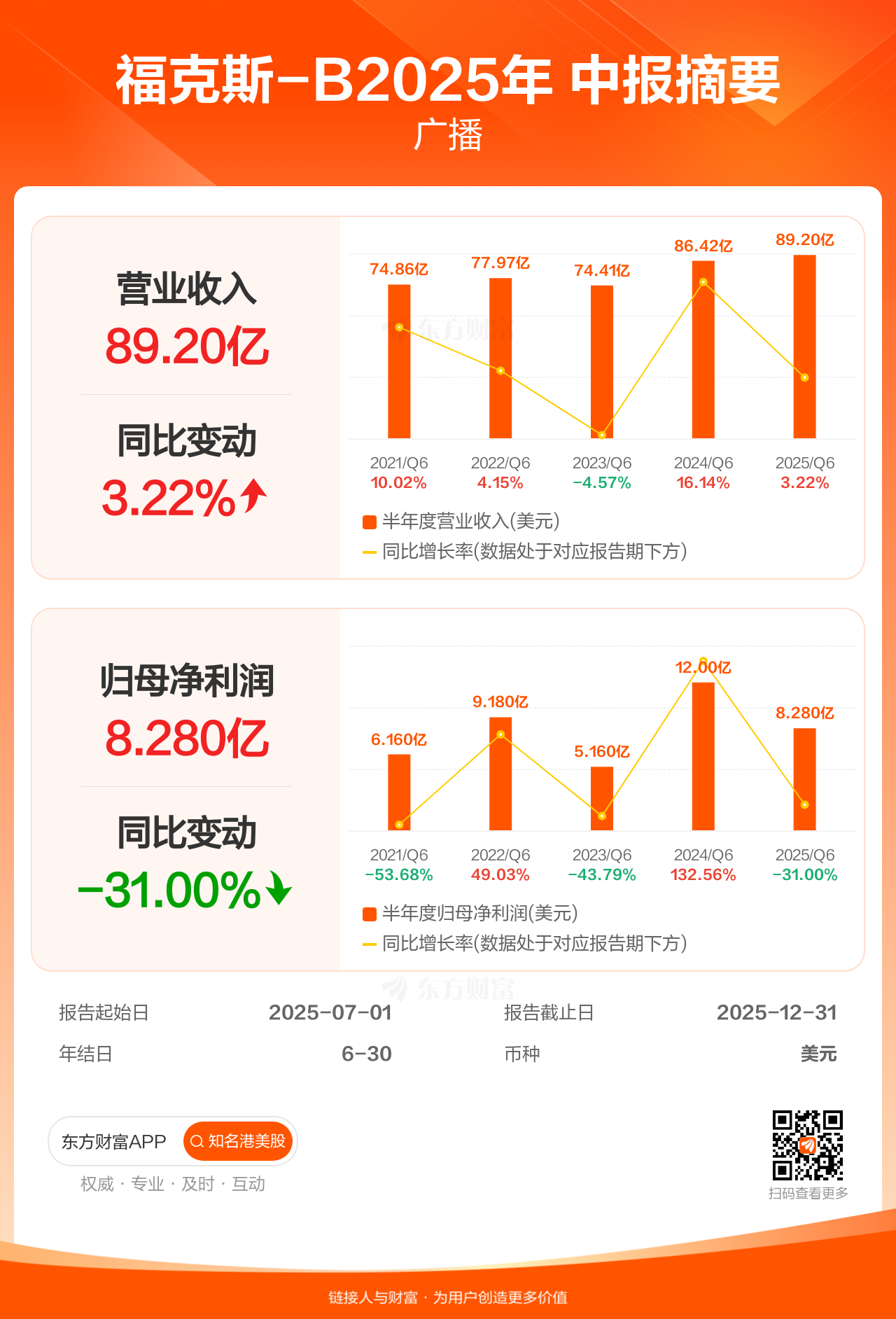 福克斯-B2月4日发布中期业绩,截至2025年12月31日的6个月内,该公司营业收入89.20亿美元,同比增长3.22%;公司权益持有人应占溢利(归母净利润)8.28亿美元,同比减少31.00%。